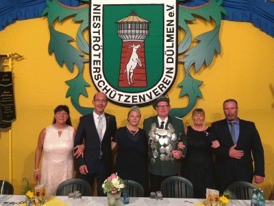 v.l.n.r.: Mundschenkpaar Barbara und Stefan Kreuznacht Königspaar Melanie Helsker und Volker Nagel Ehrenpaar Rita Nagel und Patrick Hesker